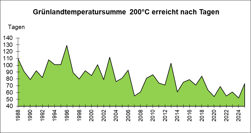 Die Grünlandtemperatursumme (GTS) wird berechnet, indem man ab Jahresbeginn alle positiven Tagesmitteltemperaturen aufsummiert – im Januar mit dem Faktor 0,5, im Februar mit 0,75 und ab März mit dem Faktor 1. Sobald die Summe 200°C erreicht, gilt der nachhaltige Vegetationsbeginn als eingetreten.